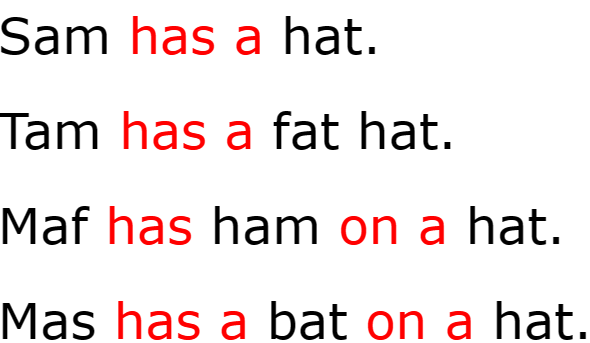The only vowel sound presented so far with the selected decodable words is the short a, and it has been combined with only five single consonants: b, s, m, f, and t.